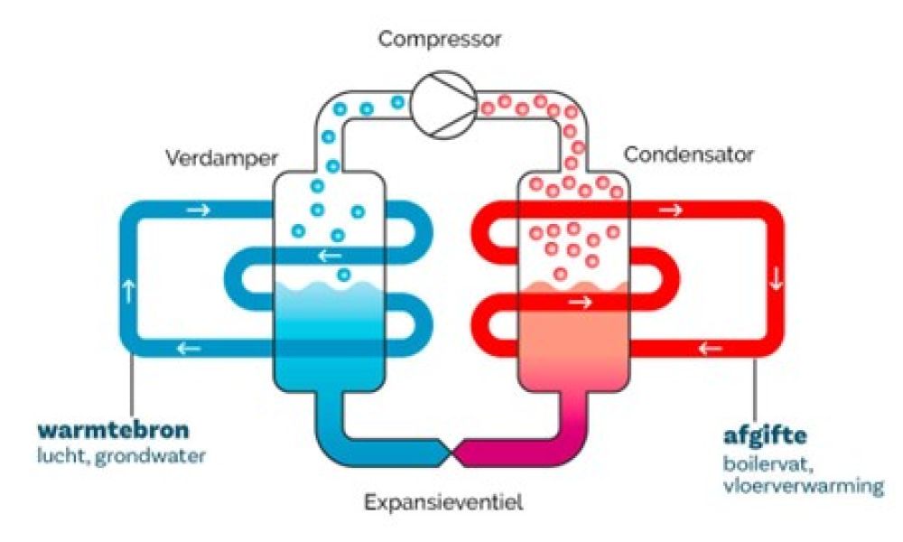 Een warmtepompsysteem bestaat uit verschillende onderdelen die het mogelijk maken om warm water te maken. In de warmtepomp zit een vloeistof (koudemiddel) die al bij zeer lage temperatuur (tot -20 graden) verdampt. De warmte van buiten zorgt er dus voor dat deze vloeistof wordt omgezet in gas (verdampt). Dit gebeurt in de verdamper. Een compressor (de pomp) perst deze damp samen waardoor de temperatuur van de damp stijgt. Deze hete damp gaat door een warmtewisselaar aan de andere kant van de warmtepomp en geeft daar zijn warmte af aan het koude water uit de cv-installatie. Door het afgeven van warmte en het verlagen van de druk (in het expansieventiel) wordt de damp weer vloeistof en kan het hele proces weer opnieuw beginnen.